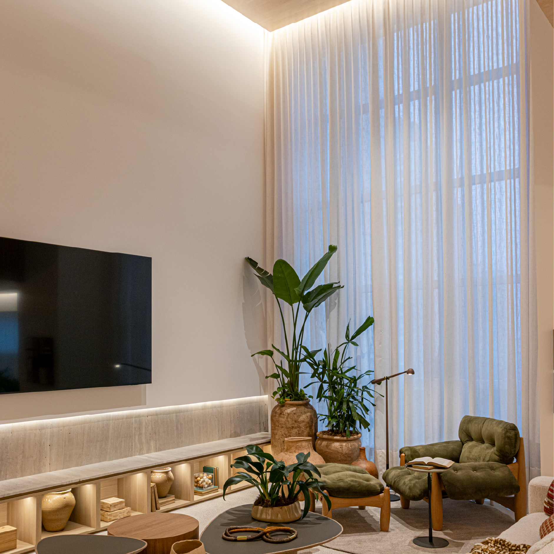 Logo ao entrar no living, a arquitetura se revela de maneira silenciosa e precisa. A amplitude do espaço, a luz natural abundante e a fluidez entre os ambientes constroem uma experiência exclusiva. O pé-direito duplo, presente no living integrado ao Espaço Gourmet, surge como um diferencial arquitetônico que potencializa essa sensação.