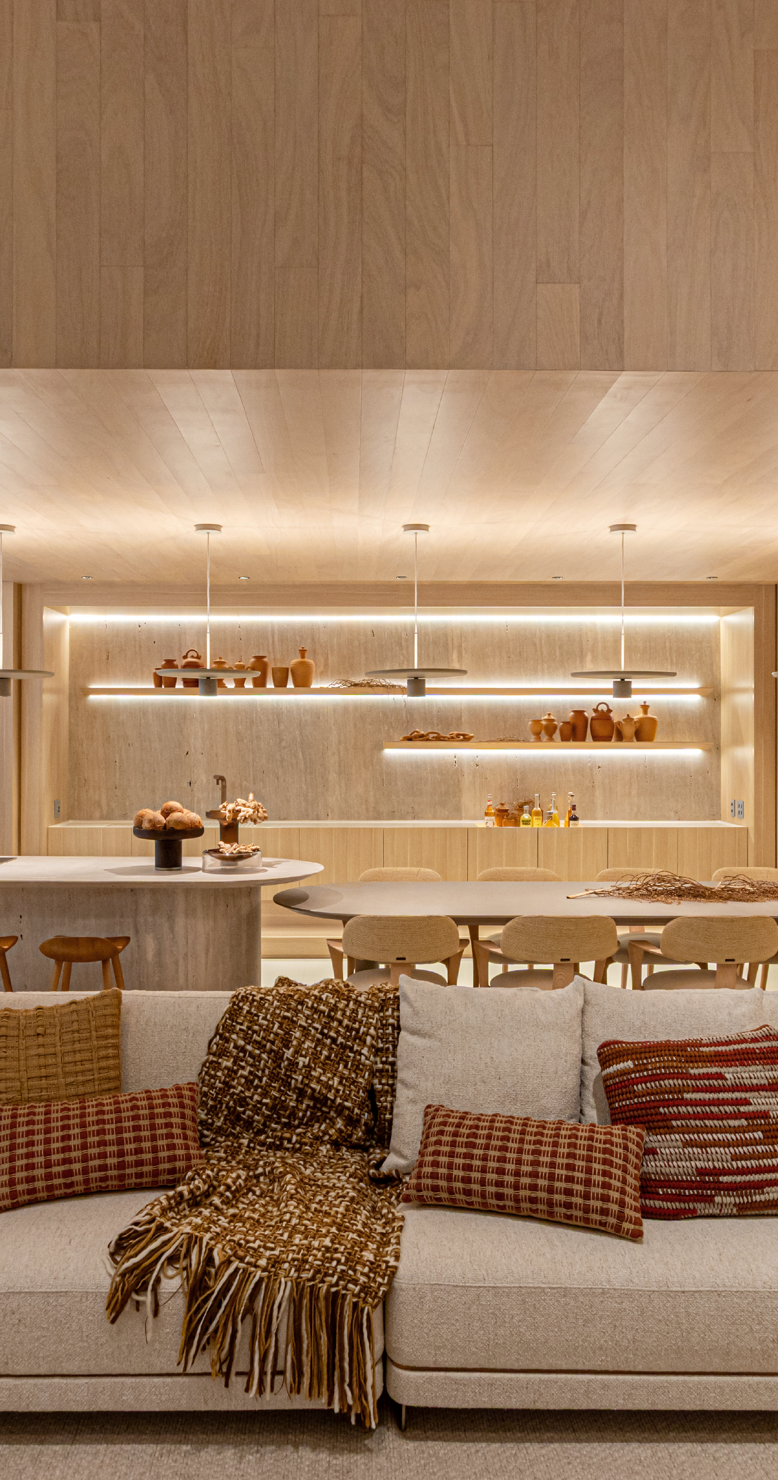 A integração entre o living e o Espaço Gourmet reforça a proposta de um morar contemporâneo, pensado para receber, conviver e viver o cotidiano com conforto. O pé-direito duplo, nesse contexto, não se impõe como elemento protagonista isolado, mas atua como parte do conjunto, ampliando o espaço, valorizando os materiais e reforçando a elegância do projeto.