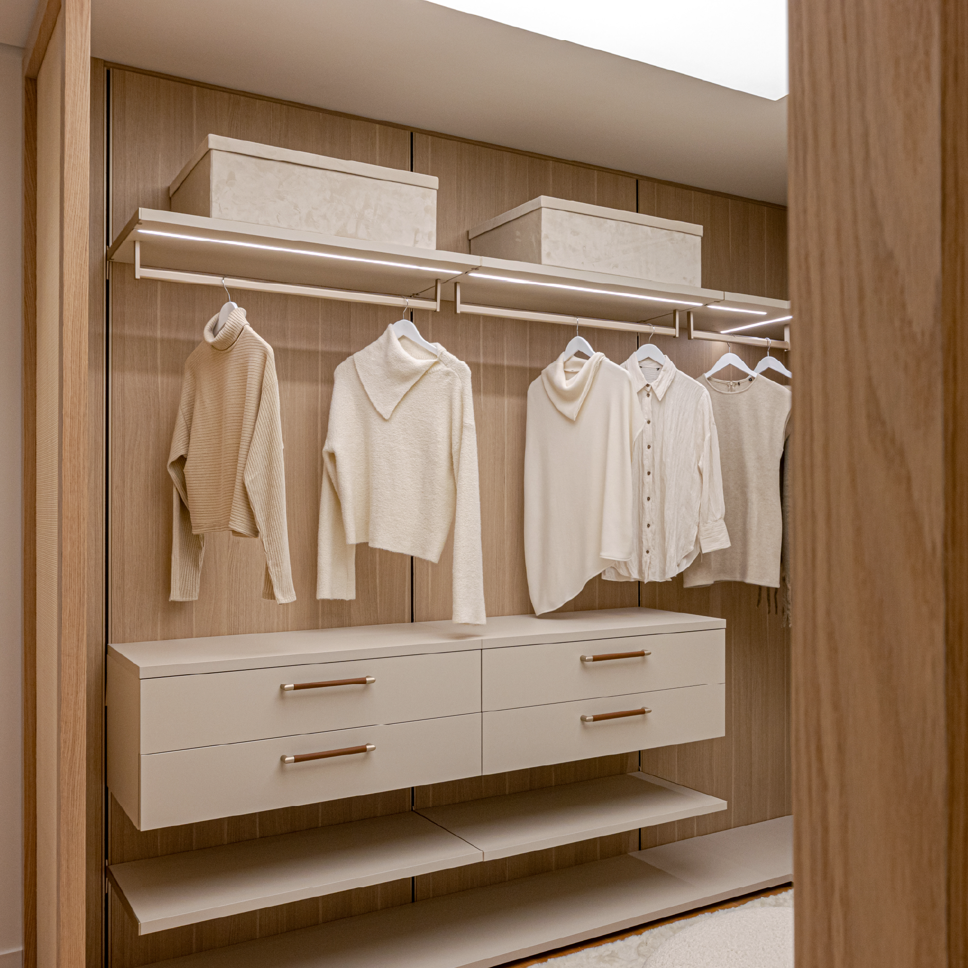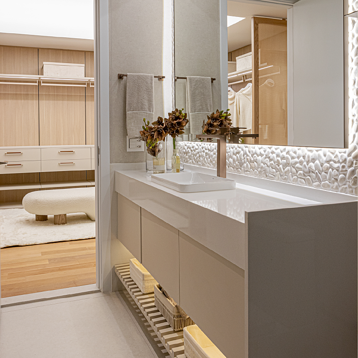 Os closets planejados e soluções inteligentes de armazenamento mantêm o ambiente visualmente limpo, reforçando a sensação de conforto e bem-estar.